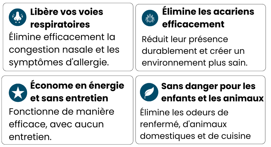 Oui ! Il aide à réduire efficacement les allergènes courants comme les acariens, les poils d’animaux, les moisissures et le pollen. Beaucoup d’utilisateurs remarquent une nette amélioration de leur respiration et de leur sommeil après quelques jours.